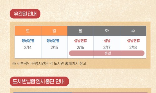 휴관기간: 2. 16.(월) ~ 2. 18.(수) ※ 일반 열람실 포함